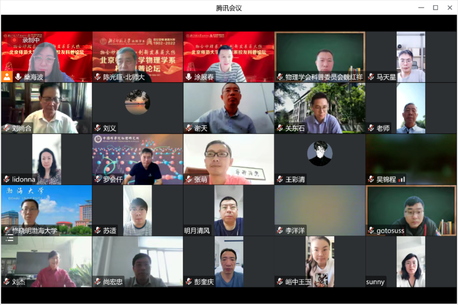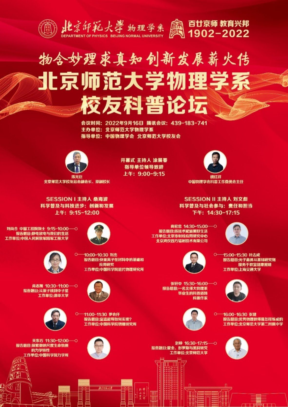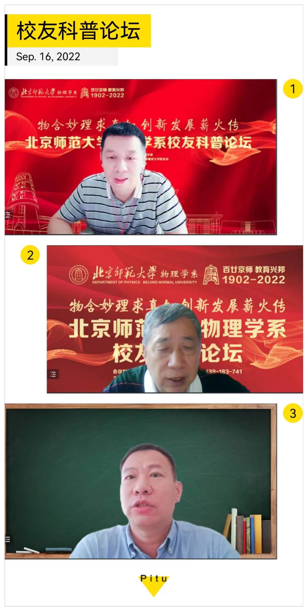 百廿京师,教育兴邦,双甲征程,初心不渝。在黑料吃瓜 欢度120周年华诞之际,物理学系积极响应“喜迎二十大,科普向未来”全国科普日活动,于2022年9月16日隆重举办了“物含妙理求真知 创新发展薪火传”校友科普论坛活动。论坛邀请了包括刘尚合院士在内的10位科学界、企业界及科普教育界杰出校友代表,为大家奉献了一场物理科普的饕餮盛宴。黑料吃瓜 校友总会副会长、原副校长陈光巨,中国物理学会科普工作委员会主任魏红祥出席会议并致辞。此次校友科普论坛活动获得了校友及社会各界的广泛关注和一致好评,在历时一天的线上直播云科普中,腾讯会议及蔻享学术平台参会人数峰值达万人以上。许多错过现场直播的校友纷纷联系组委会,希望能够收看回放。