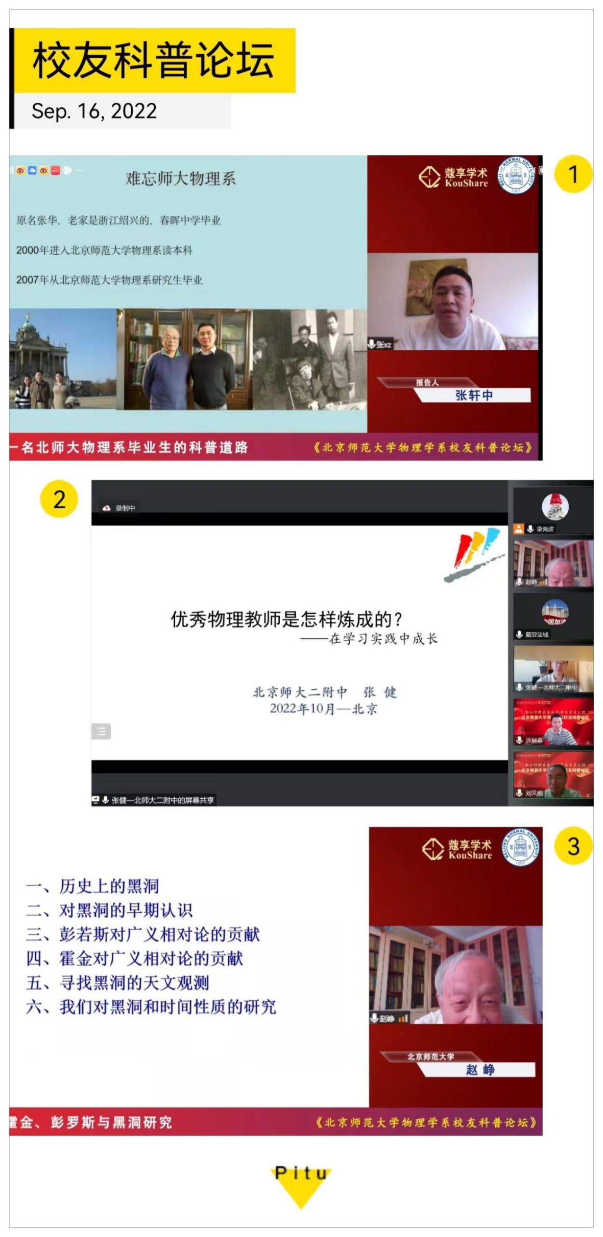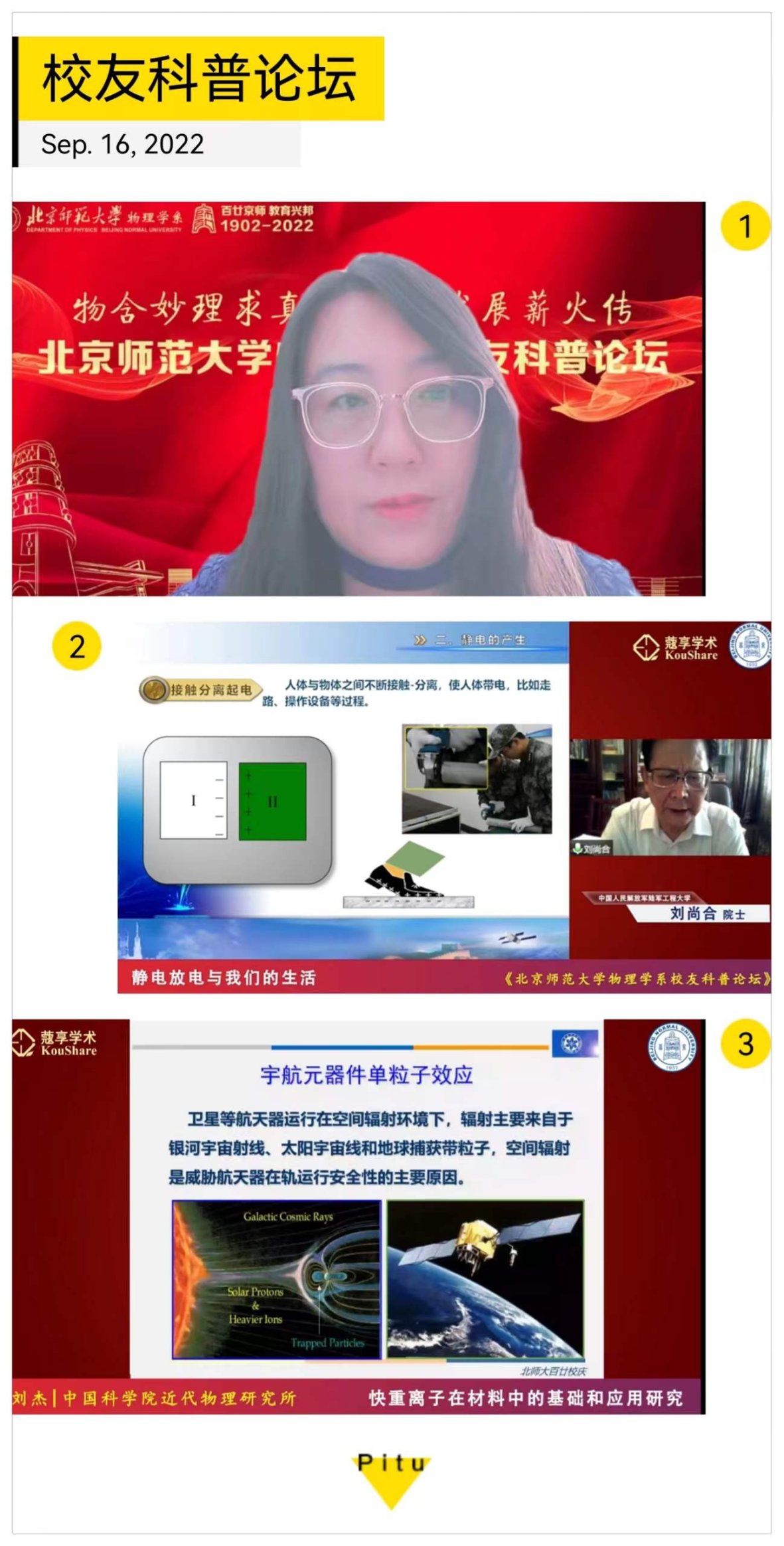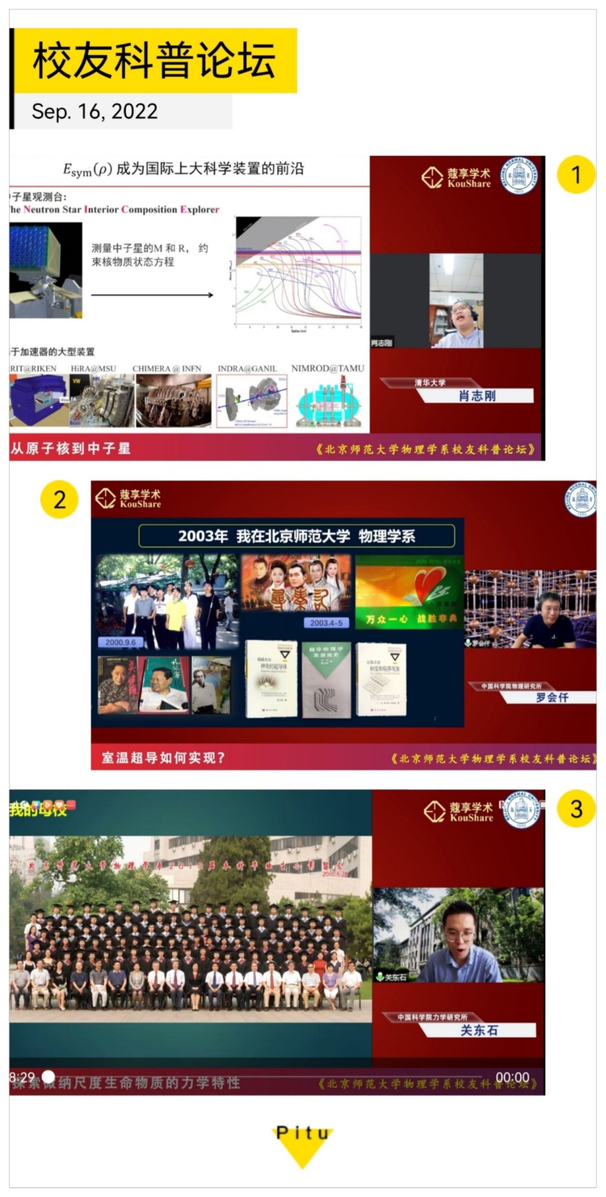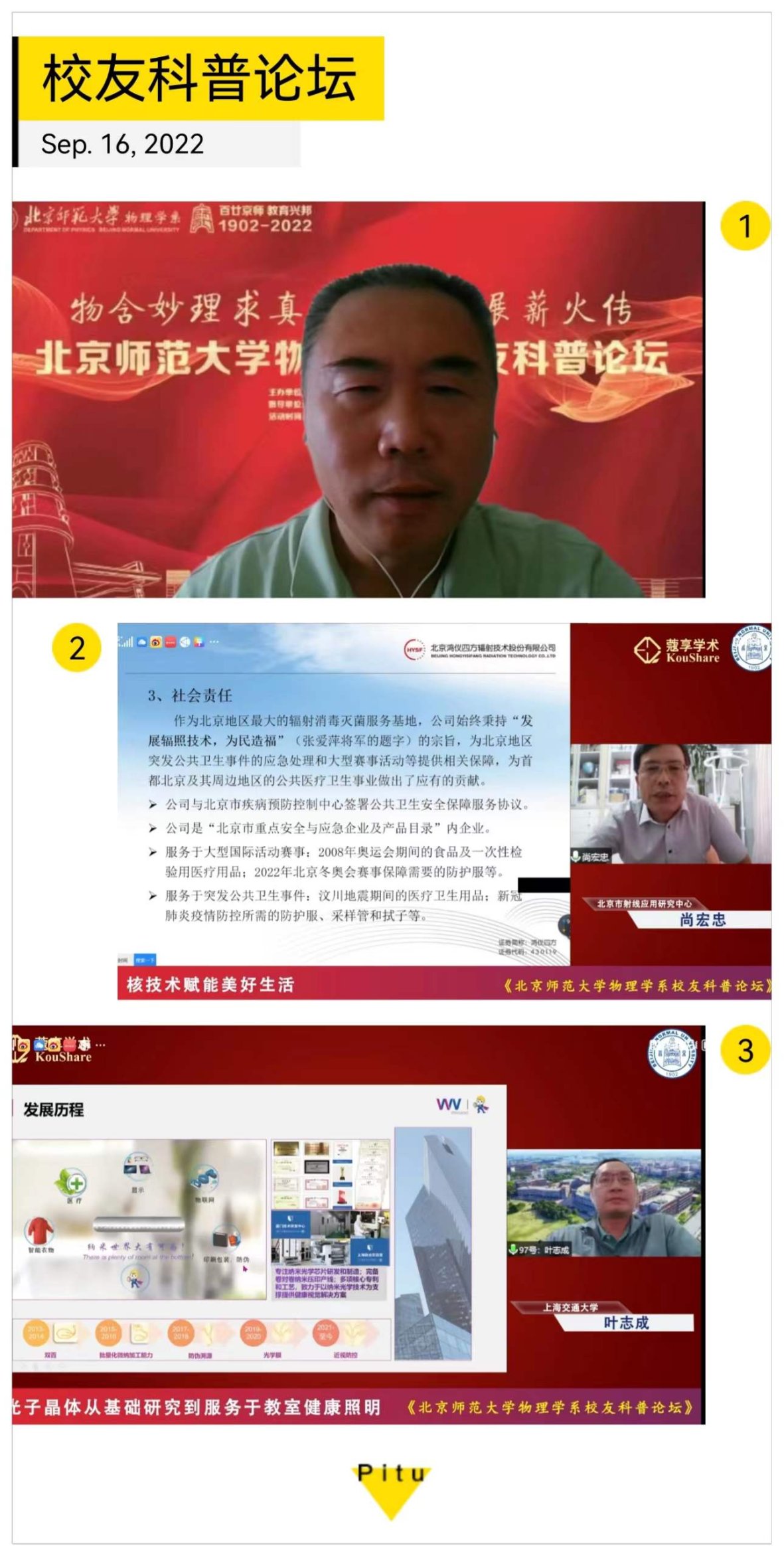 百廿京师,教育兴邦,双甲征程,初心不渝。在黑料吃瓜 欢度120周年华诞之际,物理学系积极响应“喜迎二十大,科普向未来”全国科普日活动,于2022年9月16日隆重举办了“物含妙理求真知 创新发展薪火传”校友科普论坛活动。论坛邀请了包括刘尚合院士在内的10位科学界、企业界及科普教育界杰出校友代表,为大家奉献了一场物理科普的饕餮盛宴。黑料吃瓜 校友总会副会长、原副校长陈光巨,中国物理学会科普工作委员会主任魏红祥出席会议并致辞。此次校友科普论坛活动获得了校友及社会各界的广泛关注和一致好评,在历时一天的线上直播云科普中,腾讯会议及蔻享学术平台参会人数峰值达万人以上。许多错过现场直播的校友纷纷联系组委会,希望能够收看回放。