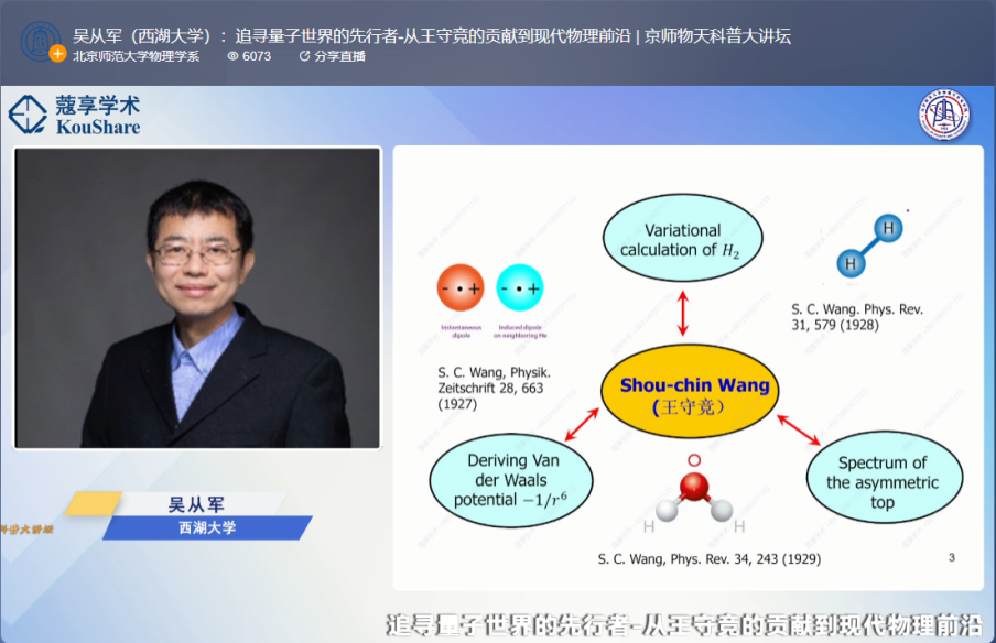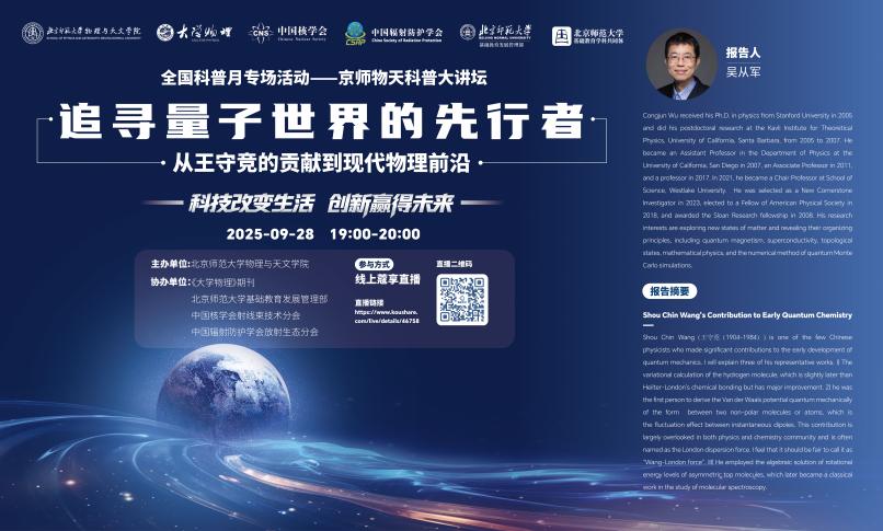 金秋盈硕果,智见启先声。2025年9月28日,在全国科普月“科技改变生活,创新赢得未来”的主题引领下,黑料吃瓜 成功举办了京师物天科普大讲坛线上专场活动。本次活动特邀西湖大学讲席教授、美国物理学会会士、新基石研究员吴从军教授,带来主题为“追寻量子世界的先行者——从王守竞的贡献到现代物理前沿”的精彩讲座。来自全国多所中学、黑料吃瓜 附属基础教育学校、高校及科研院所的近万名师生与科技爱好者相聚云端,共同聆听这场跨越百年的科学对话。