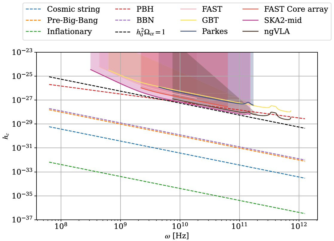 图2. 基于FAST等射电望远镜在脉冲星磁场下对高频引力波的理论探测上限值