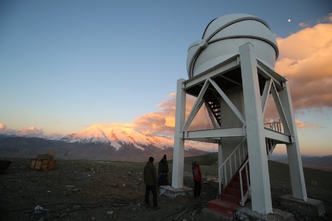 2019年7月底,经过十天奋战,天文系放置于新疆慕士塔格天文选址点的50厘米望远镜顺利安装完毕。该望远镜是天文系与中科院国家天文台、新疆天文台共建的一台高分辨率光学望远镜,望远镜由北师大出资建造,由中国科学院长春光学精密机械与物理研究所中标研制。新疆慕士塔格天文选址点是国家天文台大型光学红外望远镜台址组的重点监测点之一,初步监测结果显示其为潜在的世界级优秀台址。由于慕士塔格址点海拔高达4520米,台址尚未正式开发,条件艰苦,望远镜的运输、安装和调试难度极大。天文教学综合实验室的老师们亲临一线,与长春光机所及新疆天文台的同志共同奋战,克服种种困难,顺利将望远镜安装完毕,并进行了望远镜相关性能的现场调试。
