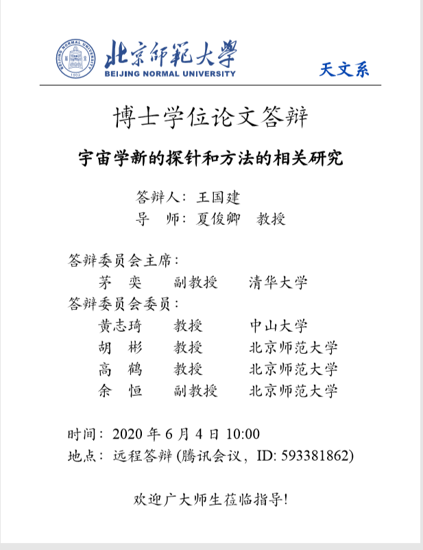 博士学位论文答辩(王国建): 宇宙学新的探针和方法的相关研究