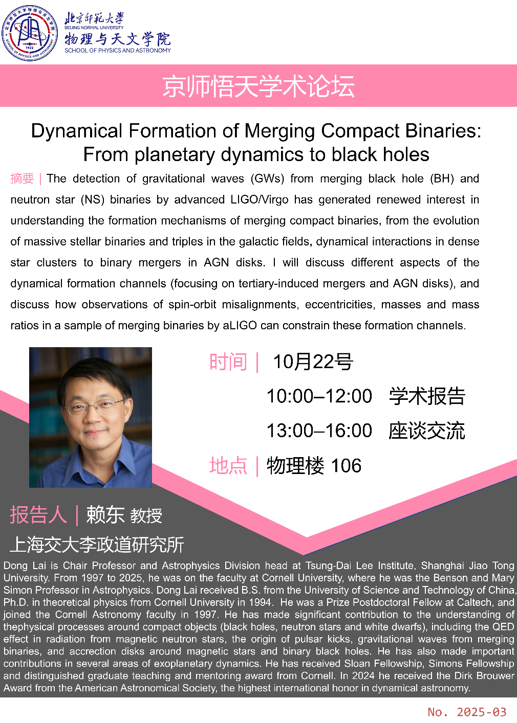 Dong Lai is Chair Professor and Astrophysics Division head at Tsung-Dai Lee Institute, Shanghai Jiao Tong University. From 1997 to 2025, he was on the faculty at Cornell University, where he was the Benson and Mary Simon Professor in Astrophysics. Dong Lai received B.S. from the University of Science and Technology of China, Ph.D. in theoretical physics from Cornell University in 1994. He was a Prize Postdoctoral Fellow at Caltech, and joined the Cornell Astronomy faculty in 1997. He has made significant contribution to the understanding of the physical processes around compact objects (black holes, neutron stars and white dwarfs), including the QED effect in radiation from magnetic neutron stars, the origin of pulsar kicks, gravitational waves from merging binaries, and accrection disks around magnetic stars and binary black holes. He has also made important contributions in several areas of exoplanetary dynamics. He has received Sloan Fellowship, Simons Fellowship and distinguished graduate teaching and mentoring award from Cornell. In 2024 he received the Dirk Brouwer Award from the American Astronomical Society, the highest international honor in dynamical astronomy.