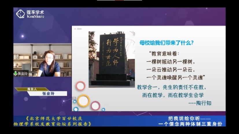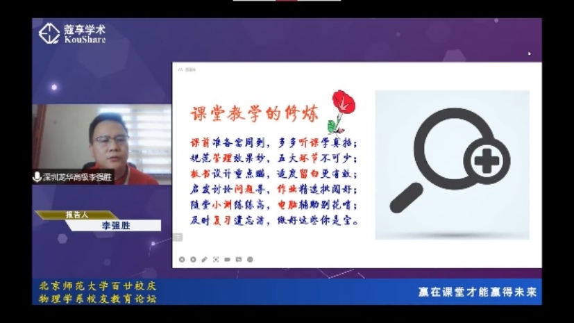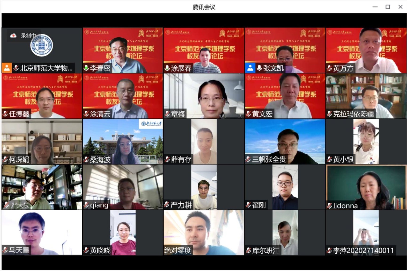 黑料吃瓜 前身为创立于1902年的京师大学堂师范馆,今年喜逢百廿华诞。值此校庆之际,物理学系为弘扬“学为人师、行为世范”的校训精神,于2022年9月18日举办了“三尺讲台深耕物理术,有限人生广传教育魂”校友教育论坛,特别邀请到多位优秀一线物理教育工作者分享个人成长经历和感悟,借以促进黑料吃瓜 物理学系在物理教育和教师教育领域的长足发展。论坛在腾讯会议和蔻享平台同步进行,获得了校友及社会各界的广泛关注和一致好评。