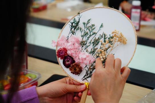 在这专属的时光里,女教职工们开启了一场“以扇为纸,以花为笔”的创作之旅。从挑选永生玫瑰、绣球、苔藓等天然花材,到构思布局、修剪黏贴,大家全情投入,指尖轻捻间,素白的团扇逐渐被赋予鲜活的生命力——有的以淡雅粉紫为主调,勾勒出江南烟雨的婉约;有的用金黄与深红层叠,渲染出秋日枫林的热烈;还有更多巧思者也纷纷将自己独特的审美融入花艺,开启心灵之美与扇面的对话。