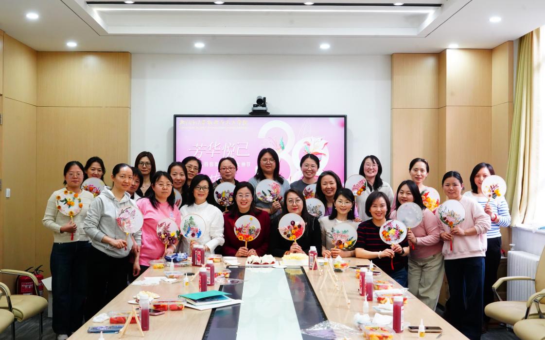 经过近两小时的精心创作,二十余把独一无二的永生花扇惊艳亮相。活动尾声,还特别安排合影留念环节,老师们手持花扇,在主题屏幕前留下倩影,镜头定格下的不仅是艺术品般的团扇,更是她们自信从容的笑容,正如这场活动的主题:这场与美邂逅的春日之约,是致礼女性力量的温柔注脚。活动结束后,大家纷纷表示,这场融合传统文化与现代美学的沉浸式体验,不仅让身心得以放松,更感受到学院对女性教职工的深切关怀。