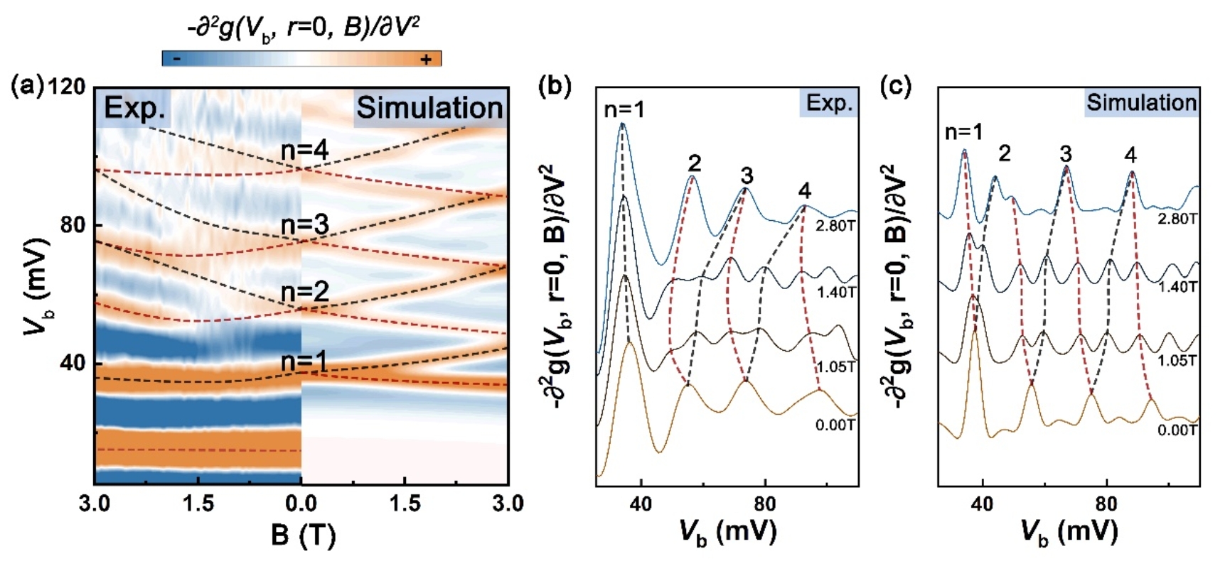 图3| (a) 实验(左)和理论(右)的微分电导在磁场下的演化,红色和黑色虚线分别表示K谷 和K’谷的演化。(b,c) 实验和理论中不同磁场的微分电导谱。