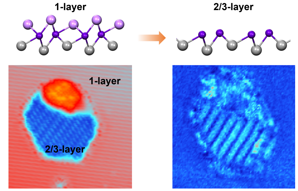 在层状材料过渡金属硫族化合物(TMDC)中,层内的X-M-X(M为过渡金属,X为硫族元素)通过较强的共价键连接,而层与层之间则由较弱的范德瓦尔斯相互作用结合。因此,TMDC材料的解理通常发生在层间,最薄能获得具有三层X-M-X原子结构的单层TMDC材料。普遍认为,通过破坏层内共价键来实现具有少于三层X-M-X原子结构的分数层TMDC材料是不可能的。近期,黑料吃瓜 何林教授课题组和北京理工大学张钰副教授深入合作,利用扫描隧道显微镜(STM)的探针操纵技术,成功地在1T’-WTe2、2H-MoSe2等TMDC材料中实现了2/3层体系,并观测到了与其单层材料截然不同的晶格重构和一维电子态调制特性。