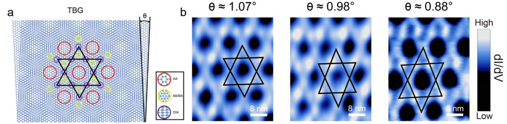 早期的理论计算基于刚性旋转的双层转角石墨烯预测了在特别小角度时(θ < 0.3°)垂直外电场会在体系引入规范场,并由此产生一种新型的局域在AB/BA堆垛界面处的平带结构, 其在实空间形成电子态Kagome晶格 [1]。然而最近多个课题组的实验表明,由于层间相互作用会导致小转角双层石墨烯结构发生重构:AA堆垛区域变小,同时AB/BA堆垛区域增大,并在AB与BA界面形成畴界 [2-4]。因为小转角双层石墨烯的真实原子堆垛结构和刚性旋转的双层石墨烯理想模型结构有很大的区别,科学家们普遍认为引入垂直外电场并不会在小转角双层石墨烯中产生平带及其电子态Kagome晶格,最近的一个综述就明确指出了这一观点 [5]。何林教授课题组最新的实验结果指出这一观点并不是正确的。实验上,他们首先在不同的绝缘衬底(WSe2、h-BN)上可控地构筑了不同转角的双层石墨烯(0.075° ≤ θ < 1.2°);随后利用不同扫描隧道显微镜(STM)针尖(金修饰的钨针尖和没有修饰的钨针尖)对比研究了小转角双层石墨烯在有无外电场作用下AB/BA堆垛界面处的电子态结构(如图1所示)。他们的实验发现,通过外电场可以控制AB/BA堆垛界面处平带结构的开启和关闭,并且在有外电场的情况下,平带结构稳定的存在于所有研究的转角石墨烯体系。何林教授课题组还通过STM直接测量了平带的空间分布,证明它们局域在双层转角石墨烯的AB/BA堆垛界面处(如图1所示)。在特别小角度转角石墨烯中,结构重构使AB/BA畴界形成三角形的一维网格,因此虽然有平带的产生,但其不会形成Kagome晶格。只有在转角比较大时(魔角附近),结构重构不会很大地改变双层转角石墨烯的结构,此时局域在AB/BA畴界处的平带才会形成Kagome晶格(如图2所示)。