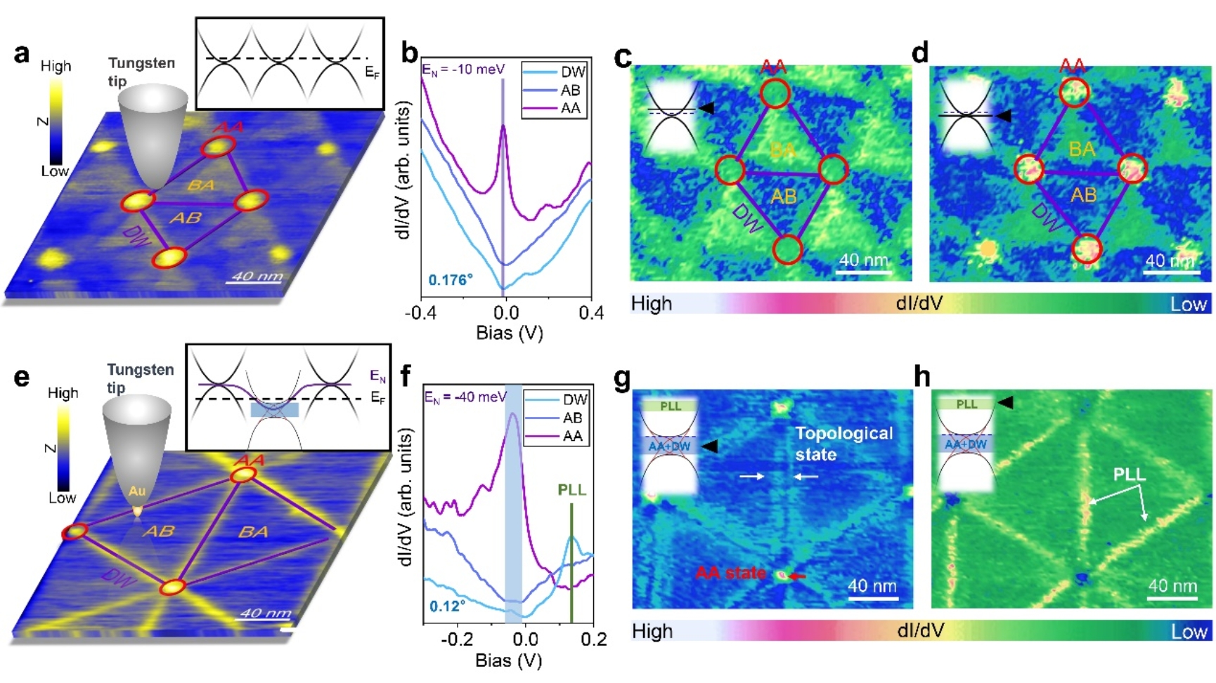 图1(a-d)利用未修饰的钨针尖对角度为0.176°的双层转角石墨烯STM形貌和STS谱学特征的测量结果。(e-h)利用金修饰的钨针尖对角度为0.12°的双层转角石墨烯STM形貌和STS谱学特征的测量结果。
