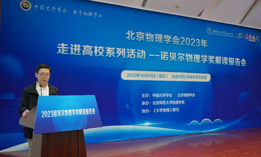 北京物理学会副秘书长秦晓文老师在致辞中指出,诺贝尔物理学奖是全球科学界的最高荣誉,见证了人类在物理学领域的辉煌成就。举办诺贝尔物理学奖解读报告会,旨在帮助科技工作者、物理教师、青少年学生更好的了解物理学的最新进展,激发广大青少年对科学的热爱和追求。历届解读报告会的成功举办,离不开北京地区高校和中学的大力支持。希望大家共同努力,为培养更多具有创新精神的青年学生,推动科技创新,实现人类梦想而努力奋斗。
