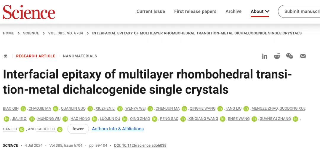 这一突破性成果以“多层菱面体过渡金属二硫系单晶的界面外延”(Interfacial epitaxy of multilayer rhombohedral transition-metal dichalcogenide single crystals)为题于7月4日发表于《科学》(Science)杂志。刘开辉教授、刘灿副教授、张广宇研究员为论文共同通讯作者。