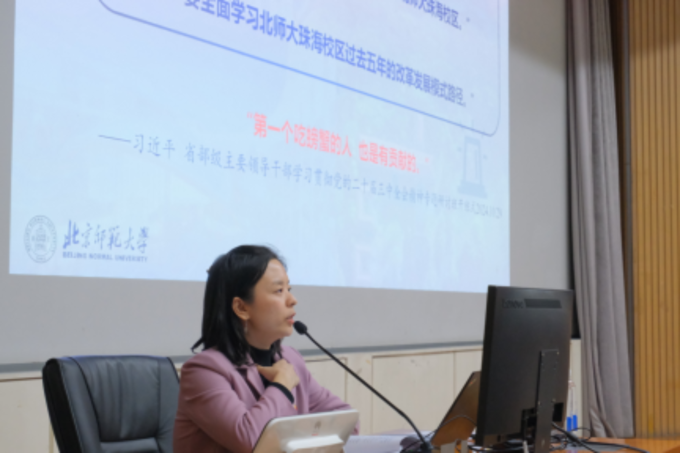 随后,陈霄老师以“极不寻常、极不平凡”为开篇,总结了学校自第十三次党代会以来的取得的光辉成就,又从党代会报告的形成过程、框架结构、主要内容等方面,详细解读了学校第十四次党代会精神的核心要义,帮助师生党员理解了很多报告表述背后的深层次考虑和丰富内涵,并对师生们广泛关注的“强师工程”、珠海校区建设等情况进行了细致解读,让大家进一步深入领会了党代会精神,也更加准确把握今后四年学校、学院的发展目标和重点任务使命。