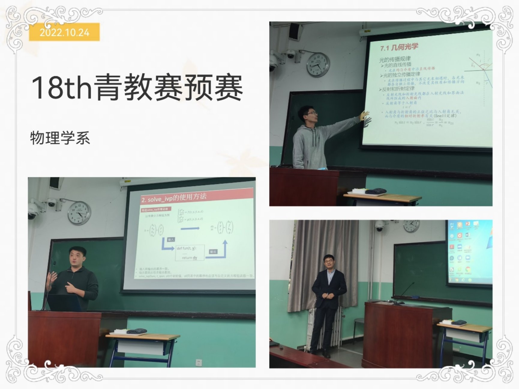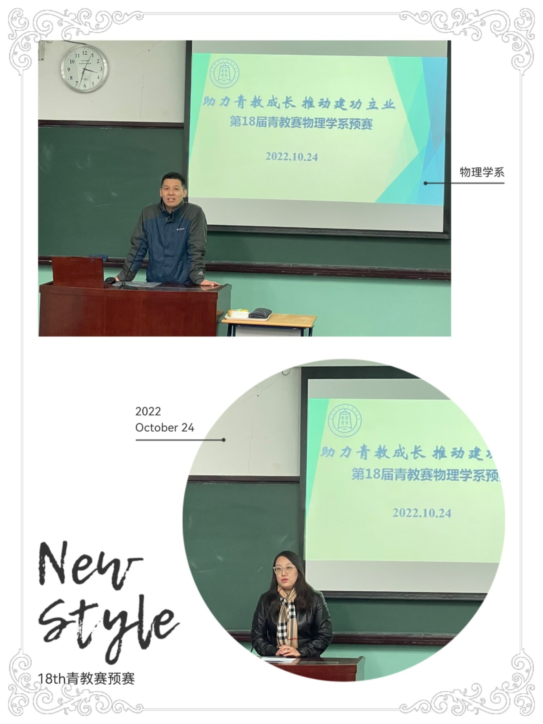桐花万里丹山路,雏凤清于老凤声。青年教师是学校的新生力量,为学校发展注入生机和活力,肩负着学校未来育人工作重任。为了让新生的花蕾在明天娇艳的绽放,让青年教师立足课堂,站稳讲台,得到更多的锻炼和提高,2022年10月24日,物理学系在物理楼108教室成功举办了第18届青年教师教学基本功比赛预赛。本次比赛邀请物理学系党政领导、物理学系教学指导委员会委员及往届比赛获奖教师担任评委。物理学系多名青年教师前往观摩学习,比赛由物理学系工会主席桑海波主持。