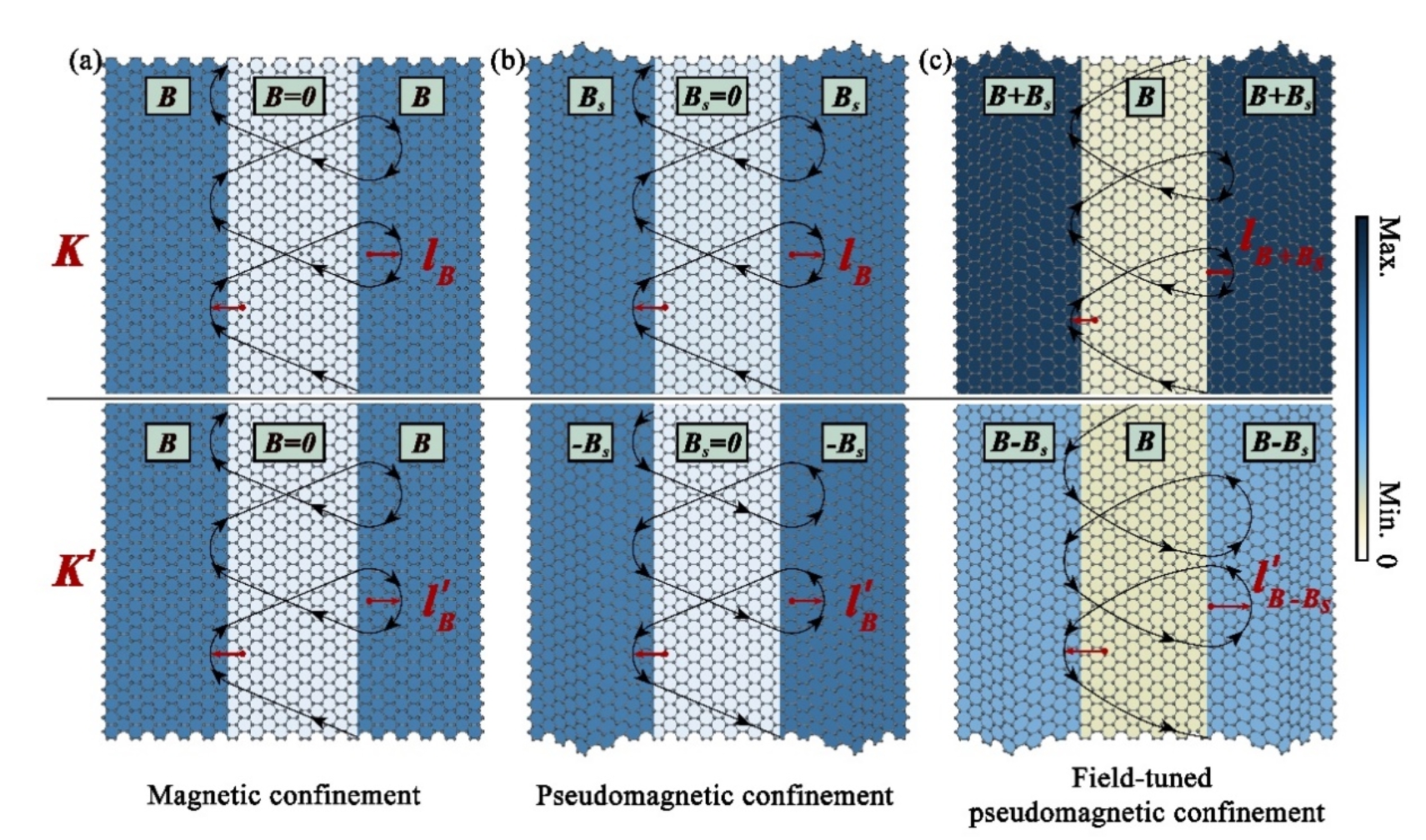 图1 (a)利用磁势垒实现磁受限的示意图。(b)利用赝磁场产生磁势垒实现磁受限的示意图。(c)利用赝磁场和真实磁场共同作用产生磁势垒实现具有谷差异的磁受限的示意图。