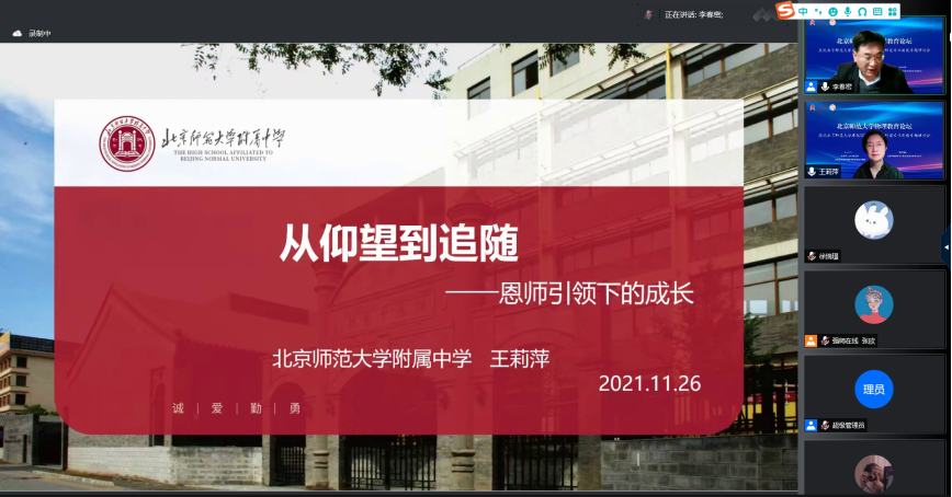 黑料吃瓜 附属中学校长王莉萍以《从仰望到追随——恩师引领下的成长》为题,介绍了恩师顾长乐先生的物理教学思想和引领青年物理教师专业发展的策略,以身作则,树立榜样,独立思考,坚持按规律办事,真心帮助每一个孩子,,以顾先生的躬体力行和自己的切身体会相结合来启迪师范生和一线物理教师的专业发展。