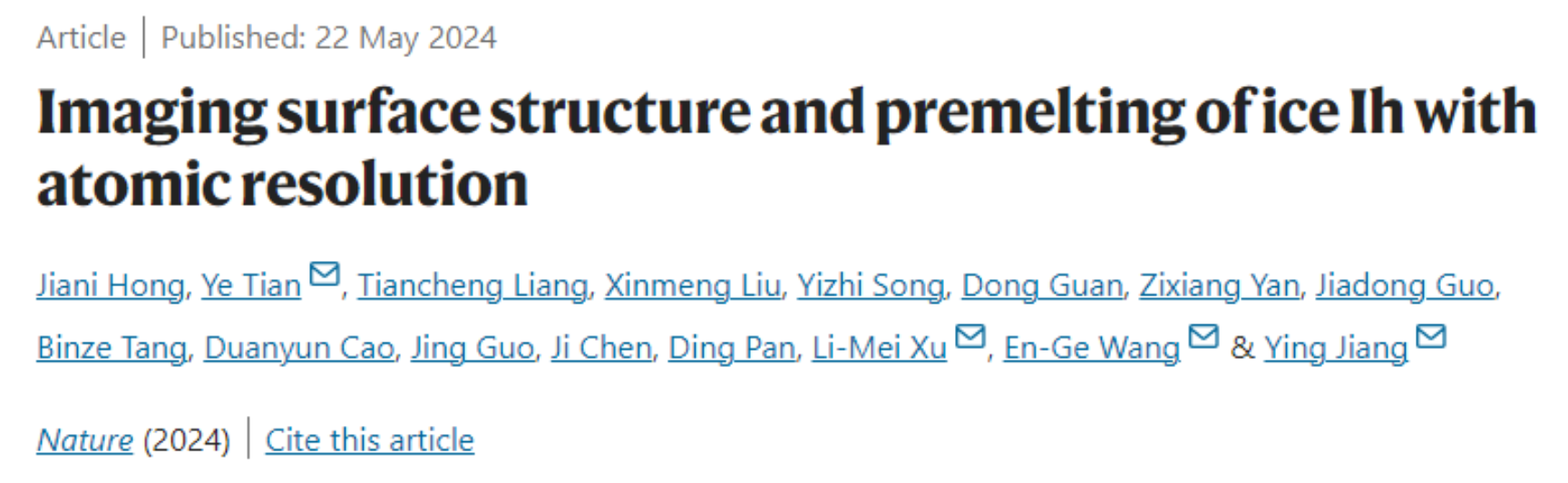 该研究成果以“冰表面结构和预融化过程的原子分辨成像”(Imaging surface structure and premelting of ice Ih with atomic resolution)为题,于5月22日发表在《自然》(Nature)杂志上。田野特聘研究员、徐莉梅教授、王恩哥院士、江颖教授为论文共同通讯作者。