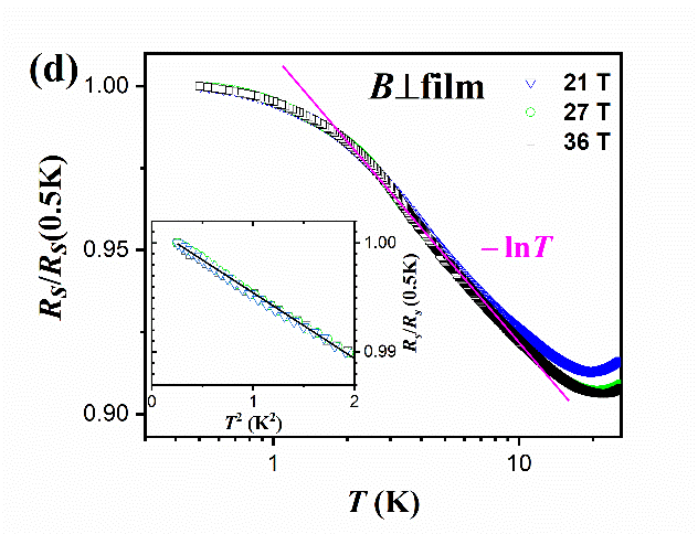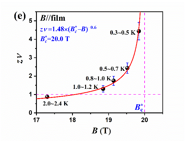 图1 | (a)面内磁场和(b)垂直磁场下的等磁Rs(T)曲线。插图是磁场范围为18-36T的低温下的放大图。红圈分别表示面内磁场和垂直磁场下极低温下19.5T和19.0T的Rs平台。(c)面内和(d)垂直磁场下极低温区的等温Rs(B)曲线。插图是磁场和电流方向的实验配置。(e)面内和(f)垂直磁场下,有限尺寸标度分析给出的临界指数zn。红色实线为基于激活标度定律的拟合曲线,水平的品红色虚线表示zn=1。