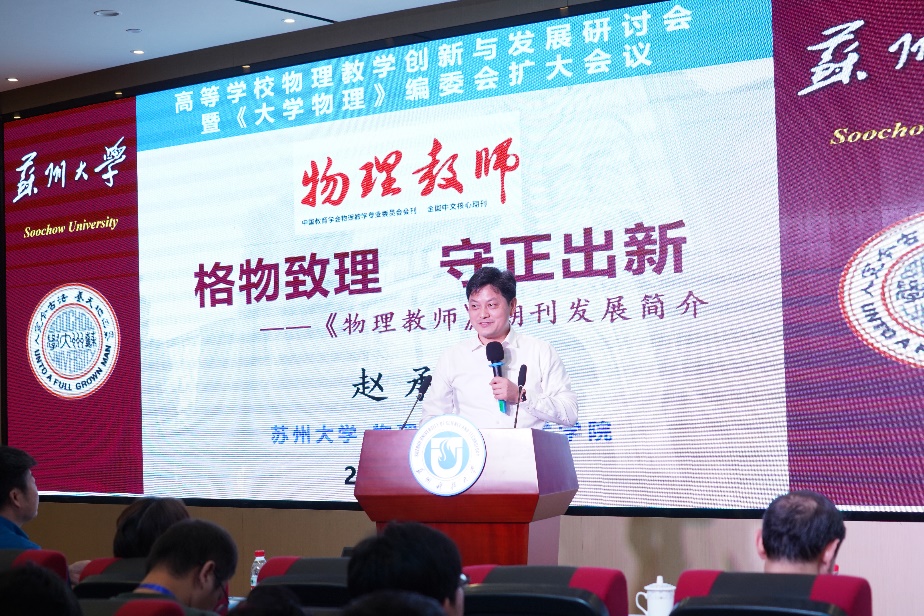 苏州大学物理科学与技术学院副院长赵承良教授做了题为“格物致理 守正出新——《物理教师》期刊发展简介”的邀请报告,他介绍了《物理教师》期刊创办和发展的光辉历程以及期刊的创办理念,强调了期刊对于当今物理学科发展的作用,希望大家积极投稿,与期刊共发展,共同为社会做出具大贡献。