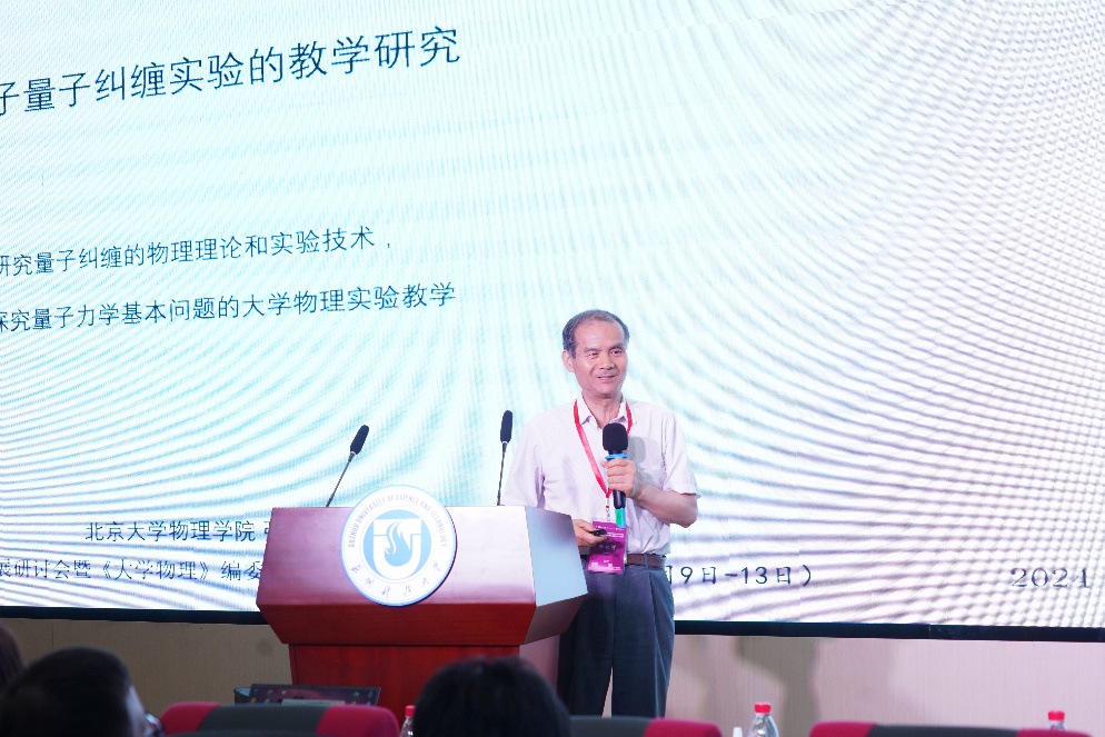 北京大学张朝晖教授做了题为“双光子量子纠缠实验的教学研究”的邀请报告,他介绍了量子纠缠问题的研究起源,并将双光子偏振纠缠实验仪用于大学物理实验教学,通过研究量子纠缠的物理理论和实验技术,发展探究量子力学基本问题的大学物理实验教学。
