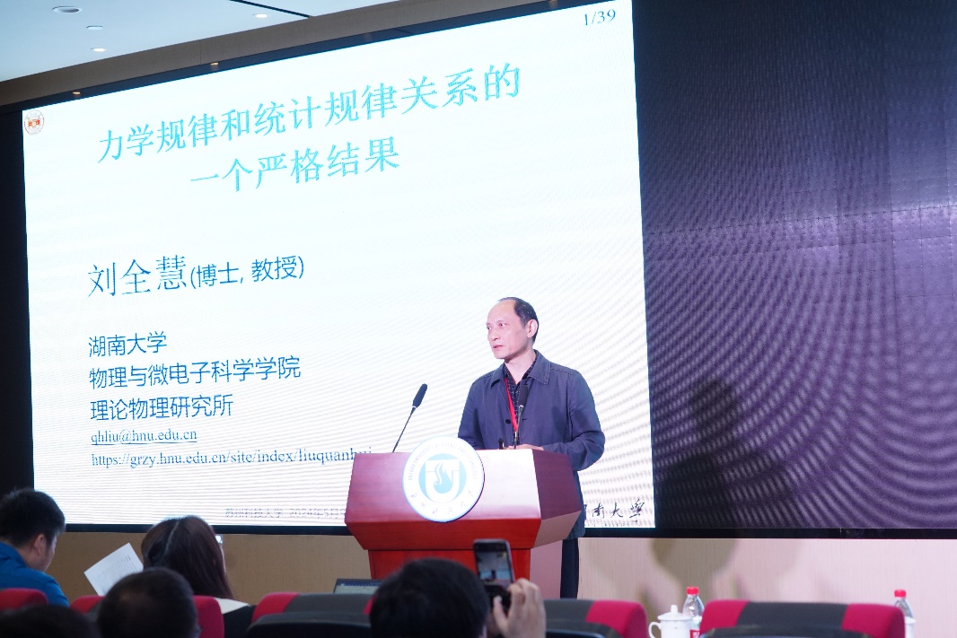 湖南大学刘全慧教授做了题为“力学规律和统计规律关系的一个严格结果”的邀请报告,他介绍了利用一个严格可解模型,发现了一种利用不变频率来分辨力学规律和统计规律的探针,指出统计规律和力学规律之间存在联系也有鸿沟。