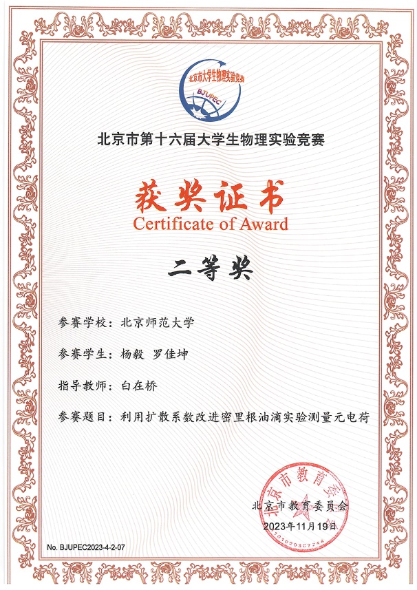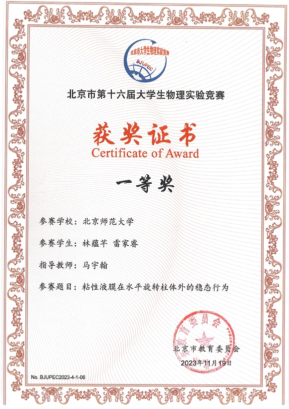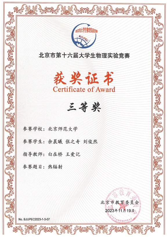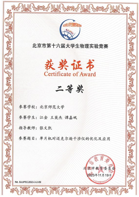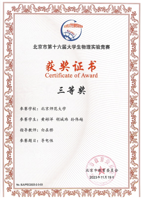 2023年11月19日,由北京市教育委员会主办、北京交通大学承办的第十六届北京市大学生物理实验竞赛在北京成功举办。共有来自35所北京和华北地区高校的150支队伍、500余名同学参加。由黑料吃瓜 物理学系选拔组织的7支队伍共17名同学参加了本次竞赛并取得佳绩,2支队伍获得一等奖、3支队伍获得二等奖、2支队伍获得三等奖。