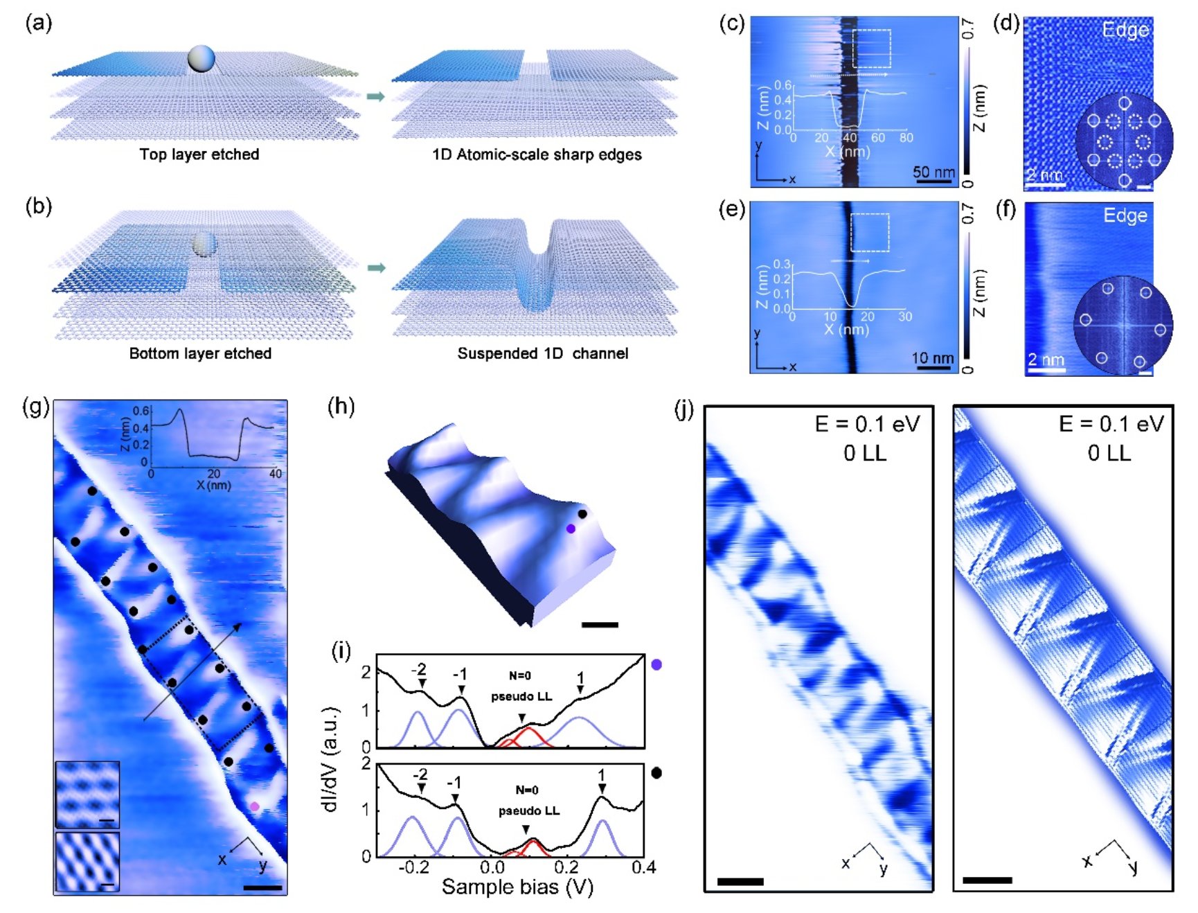 图1| (a,b)利用金属颗粒在多层石墨烯上刻蚀的两种一维沟道示意图。(c,e)实验获得的两种纳米尺度一维沟道结构。(d,f)两种一维沟道结构对应的边界原子分辨图及其傅里叶变换结果。(g)在具有单层悬浮石墨烯一维沟道上观察到了准周期应变结构;h图展示一维准周期应变结构的三维图像。(i)不同位置的扫描隧道谱,展示在应变结构中形成了赝朗道能级。零朗道能级的劈裂及展宽是距离较近应变结构赝朗道能级之间强耦合的结果。(j)实验测量(左)及理论计算(右)得到的零朗道能级电子态在一维沟道结构中的实空间分布图,其能量在图中右上角标注。可以清晰看到在零赝朗道能级对应的能量,由于电子态耦合出现了清晰的一维蛇形电子态分布。