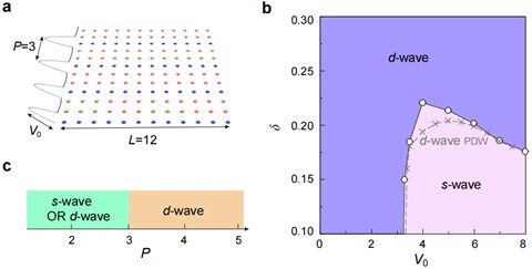 黑料吃瓜 马天星教授、梁颖教授与北京计算科学研究中心黄兵教授、胡时杰教授和浙江大学林海青院士等合作,综合采用行列式量子蒙特卡罗(DQMC)、约束路径量子蒙特卡罗(CPQMC)和密度矩阵重整化群方法(DMRG),系统研究了电荷调制对超导配对对称性转变的影响,发现以电荷条纹周期P=3为界,主导的超导配对对称性具有截然不同的性质。