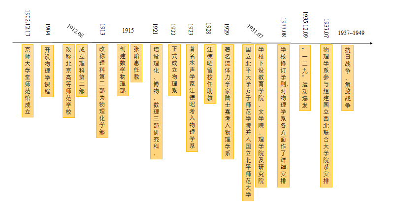 从京师大学堂师范馆创立到新中国成立期间,黑料吃瓜 及物理系主要大事件时间轴如图8所示。