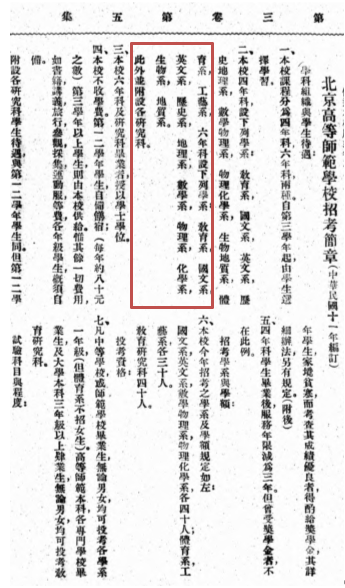 在1922 年出版的《教育丛刊》第3卷第5期的24-27页,记载了《北京高等师范学校招考简章(中华民国十一年编订)》,其中“六年科设下列学系”包括“物理系”。所发布的招生简章提到,报名时间为当年7月20至8月24日,“试验”时间为8月26日,各省区选送生报道时间为9月14日,复试时间为9月15日。该文件可作为1922年黑料吃瓜 物理系设立的关键参考。如图4所示。