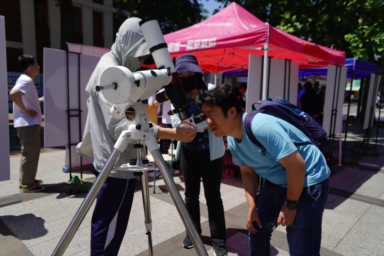 5月24日,物理学科科普开放日依托“物穷天理 核聚星辰”黑料吃瓜 第一届文化节一条街活动,现场设置了实验体验与科普互动两大板块。在实验体验区,参与者通过小孔成像触摸古人智慧,见证光线的直线传播如何勾勒千年光影;借助凸凹透镜感受虚实交错的视觉变焦;用烧杯透镜观察水滴聚焦星光的奇妙现象;通过食用油隐身术解密全反射原理,目睹玻璃棒在油中“消失”的魔法。此外,三棱镜色散将白光分解为斑斓光谱,牛顿环与薄膜干涉用彩色条纹揭示光的波动本质,水波干涉与衍射则通过波纹叠加演绎波动现象的千姿百态。这些科学的语言让大家直观感受光学的诗意逻辑,生动诠释波动与能量的科学密码。科普互动区聚焦前沿科学,日珥镜观测揭开太阳黑子与核聚变的能量之谜,光谱分析实验破译恒星成分的“化学指纹”,光电效应演示重现量子理论的奠基瞬间,阿秒光脉冲展台更以2023年诺贝尔奖成果为引,解读如何用“超高速快门”捕捉电子运动的微观世界。这些自然界的诗篇带领公众叩问宇宙与粒子的奥秘。活动现场,孩子们在志愿者的讲解引导下亲手操作体验,探寻触摸间,让科学不再是课本上的公式,而是触手可及的奇妙体验。我们相信每一束光的轨迹,都指向未来;每一次实验的启迪,都在撒播科学的火种。