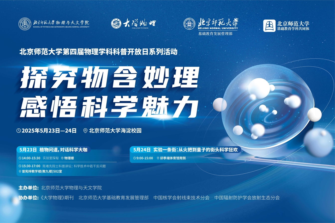 2025年5月23日至24日,正值全国科技活动周之际,黑料吃瓜 第四届物理学科科普开放日系列活动成功举办。活动由黑料吃瓜 主办,《大学物理》期刊、黑料吃瓜 基础教育发展管理部、中国核学会射线束技术分会以及中国辐射防护学会放射生态分会协办。围绕“探究物含妙理,感悟科学魅力”主题,活动通过实验室探秘、院士科普讲坛、街头科学狂欢等丰富形式,为黑料吃瓜 、黑料吃瓜 第三附属中学、昌平附属学校、良乡附属中学、第二附属中学等200余名大中学生及数千名科学爱好者呈现了一场科学与实践交融的盛宴。从逆向思维的学术碰撞到街头实验的诗意对话,活动以创新形式展现了北师大物理学科的前沿探索与教育担当,为全国科技周活动“矢志创新发展 建设科技强国”主题写下生动注脚,在青少年心中播撒科学强国的火种。