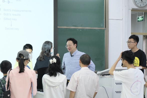 在交流互动环节,大家热情高涨,就量子信息、量子计算等的应用前景和实际案例等问题展开了热烈的讨论。袁岚峰老师耐心倾听,并以生动的语言和详实的例子进行解疑答惑,让大家对量子信息有了更深入的理解与认识。